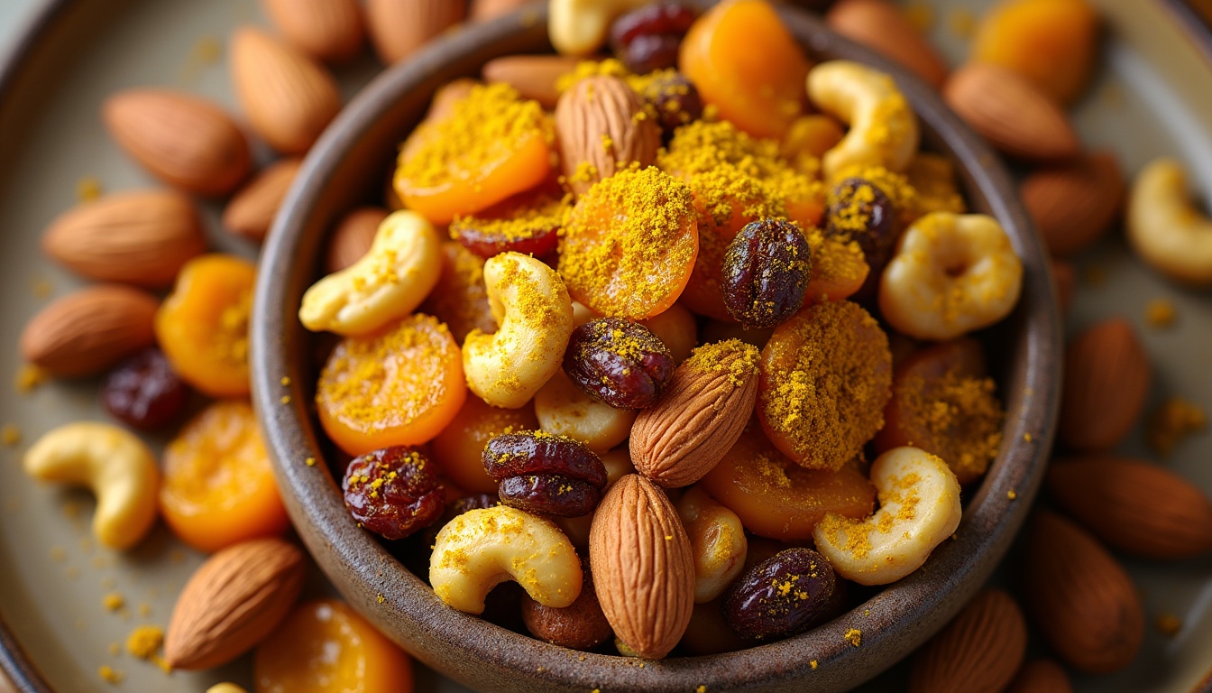 Ingrédients : amandes, noix, raisins secs, curry, sel