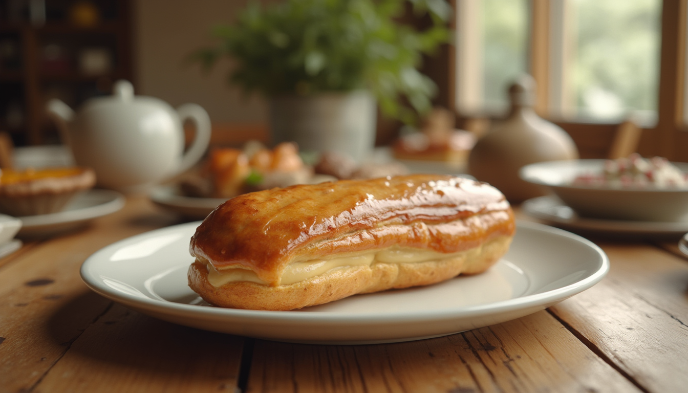 Éclair gourmand et original, combinant la légèreté de la pâte à choux à une crème riche et savoureuse à la cacahuète, pour une touche croquante et réconfortante.